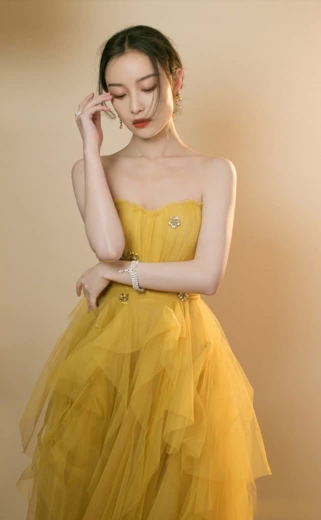 这种裙子展现出她那优越的身材,长款的版型展现出高挑苗条的身材,看上去气质很独特,优雅大方的样子很吸睛。不得不说,倪妮真的是肤白貌美,冷白皮太让人羡慕了。薄纱黄色长裙也很显气质,美出了新高度。